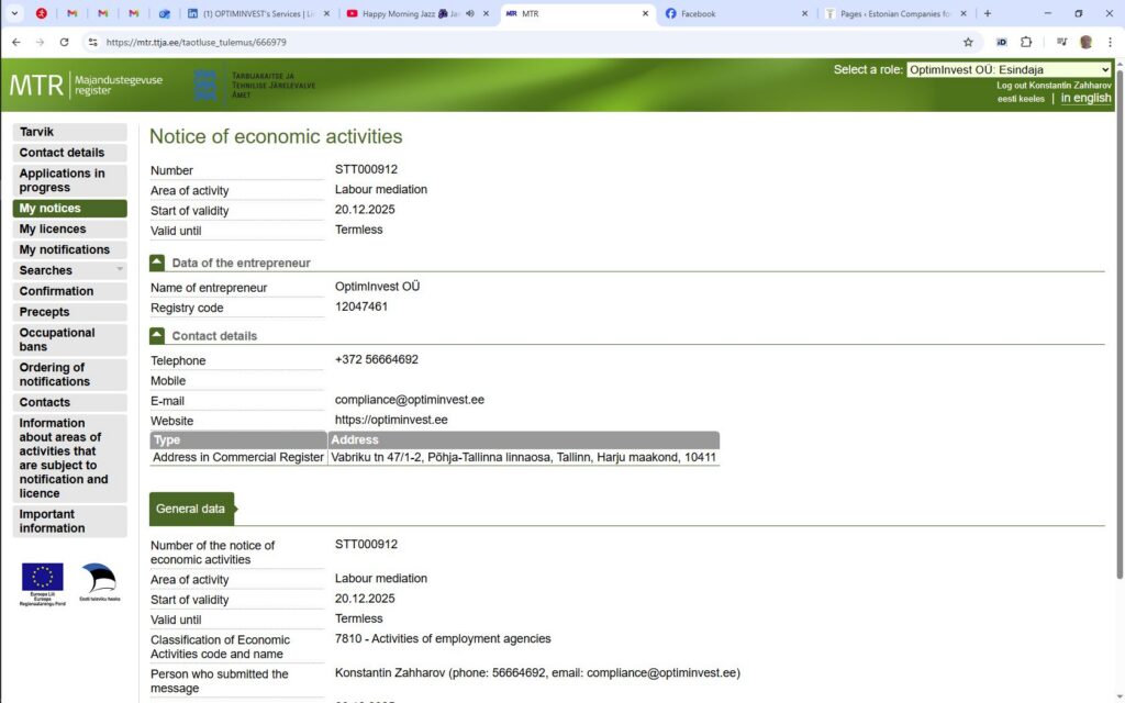 (services – for an entrepreneur – licences and registrations – Entering the Register of Economic Activities)